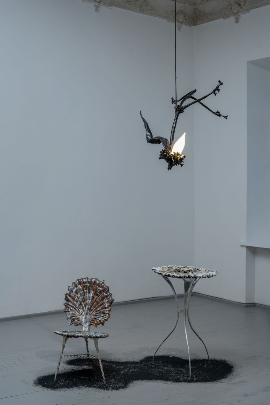 Fascinated by traditional techniques, the two creators are perverting the inherent codes of object design by an uninhibited manipulation of the material, where plastic becomes glass, where mirrors are stained with an irreverent gesture. The corpus of pieces proposed are frozen liquid and vegetal figures, polymer in a transitory state, collages, a phantasm of a domestic space where objects are exhibited and erected. Plastic, white gold leaf, glass and fiberglass, oak and galipot, all these materials are merged in the artists' gesture without hierarchization.