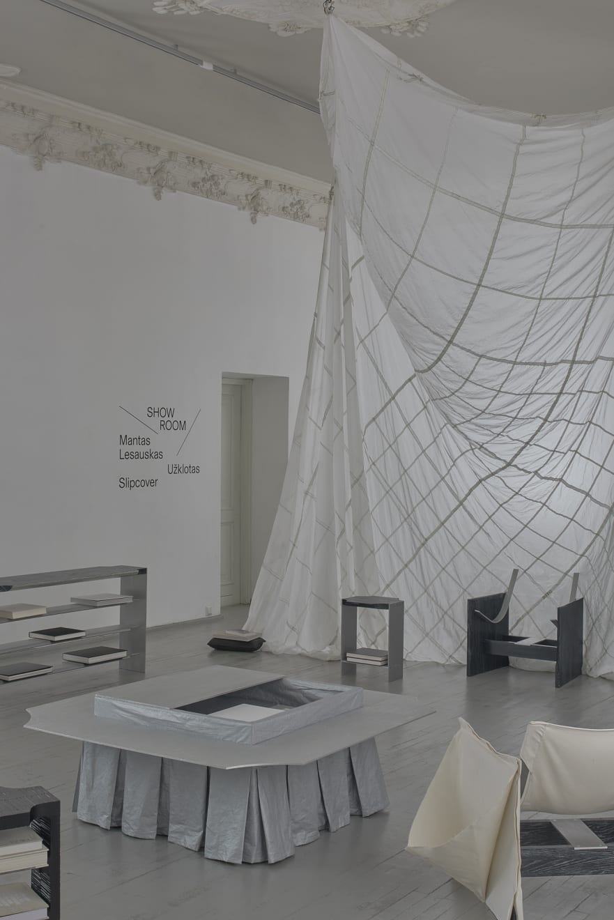 This time you will discover the series of design objects "Slipcover" by designer Mantas Lesauskas. This is a series of furniture pieces created over two years, inviting reflection on the challenges of the last years of the pandemic and the anxiety of the ongoing war in Ukraine. The objects in the exhibition feature a recurring motif of draped fabric that, in various forms, invites us to reflect on the current issues of the past years. In the face of war, we protect not only our lives and those of our loved ones, but also our personal and collective cultural heritage from enemies and invaders, and books remain one of the most effective means of passing on this heritage, which is why the image of a temporarily draped and preserved culture is the focus of this exhibition.