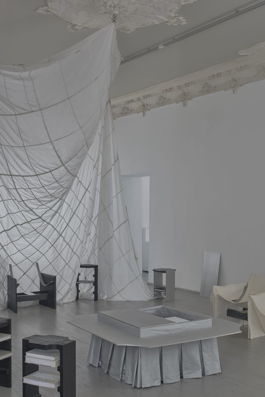 Mantas Lesauskas' furniture reminds us that design is the love language of objects. In this exhibition, it is deceptively firm, without immediate betrayal of its intentions. Silver-plated aluminium, limed oak, parachute pleats - a militaristic Gothic that seems to leave no room for tenderness. Yet the soul of these objects is subtle: they are the readers' furniture on which the stories rest. Their stark structures and rich materials legitimise the experiences that separate life from survival. The discipline that binds them together comes not from the need to defend but from the desire to nurture, to have something to lean on in every chapter of life. When we surrender to these things, we become the softest parts of them. We can read the titles of books from all sides, strip the table in search of its legs, try to pull a duck out from under a shelf, and do other little things to which we do not typically attach much interpretation. We can fill the crevices of the armchairs with our own little perversions and stock up for the next winter of pain when there is nothing left to draw from. The soulfully shimmering curtain in the exhibition is like a thin line you only experience in free fall or when you watch a mystery end. These carefully honed and deliberated objects prepare to live on in various colours and with different surfaces, to speak to future strangers in a new love language of objects.