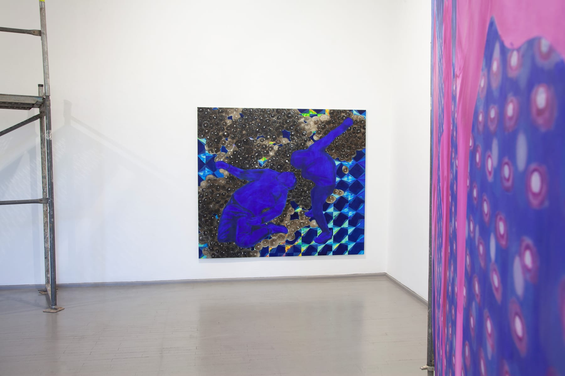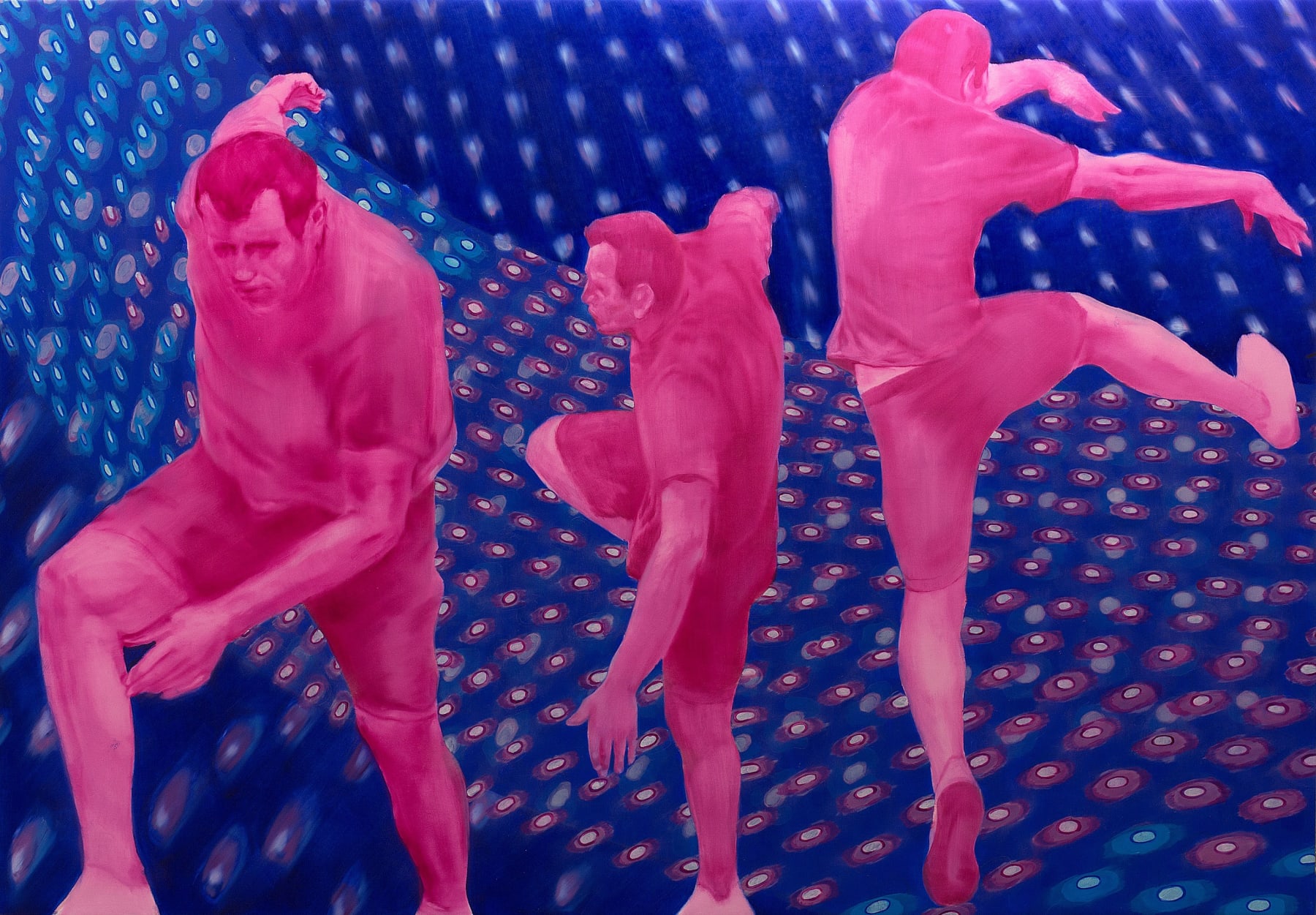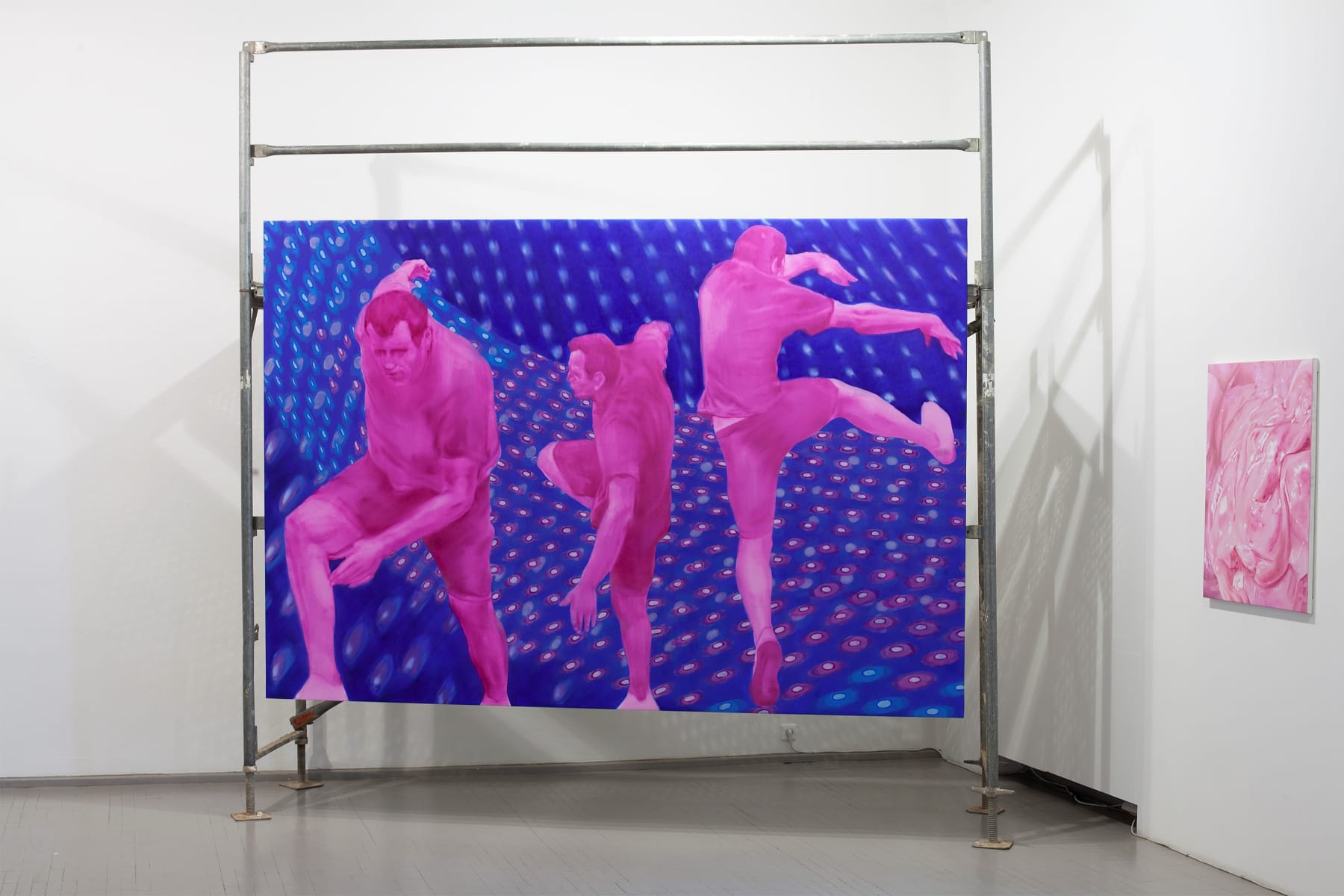 “Thirst” is a project that mixes personal experiences, visual and textual material from news portals, social media, mass media, and details of everyday life. Cut-out, recycled images from the crime scene intertwine with a finger dipped in still-sticky, drooling chewing gum, a rippling casino scoreboard, or a strobe-cut image. These and many other fragmented images lie on canvases together with fighting, or perhaps dancing figures? "In a crowd, the fool, the ignorant and the envious are freed from a sense of inferiority and powerlessness - it is replaced by the effect of brute force - temporary but powerful." (Gustav Le Bon, "The Psychology of the Crowd"). The innate need to gather in groups, desires, illusions, the authority of the leader encourages to take extremes, unrelenting impulses take over. The multi-figure compositions pulsate with pungent, "chemical" colors that leave a blurred line between aggression and (dis)pleasure. The paintings are associated with dance and club culture. This is not too different from riots, gatherings in sports arenas or peaceful communities - a crowd of people, like one organism, affected by the same stimulus. The aspect of the ritual is also important, the desire to gather into ‘neo-tribes’, to break away from the routine, to experience unique, maybe even ecstatic states.