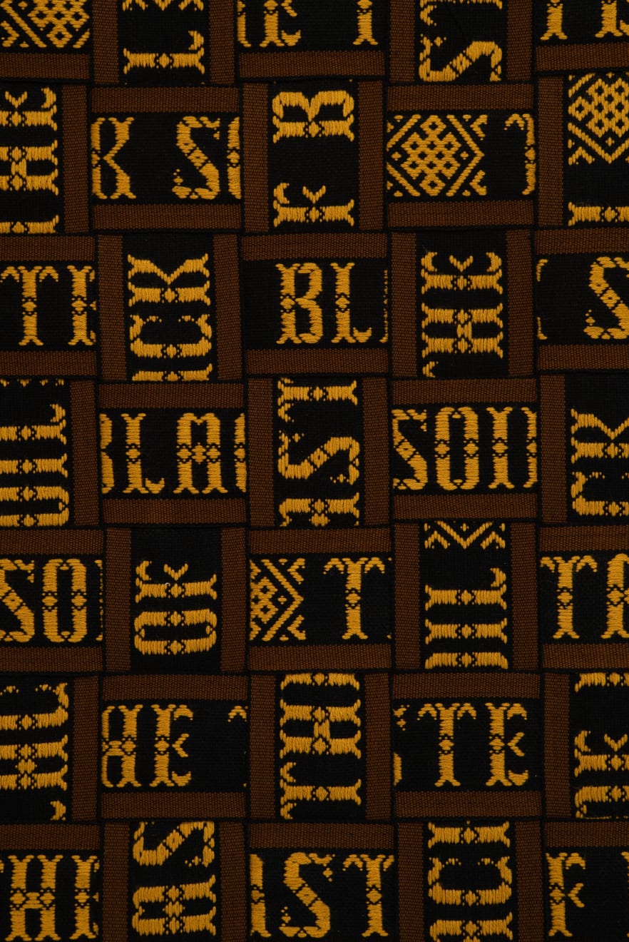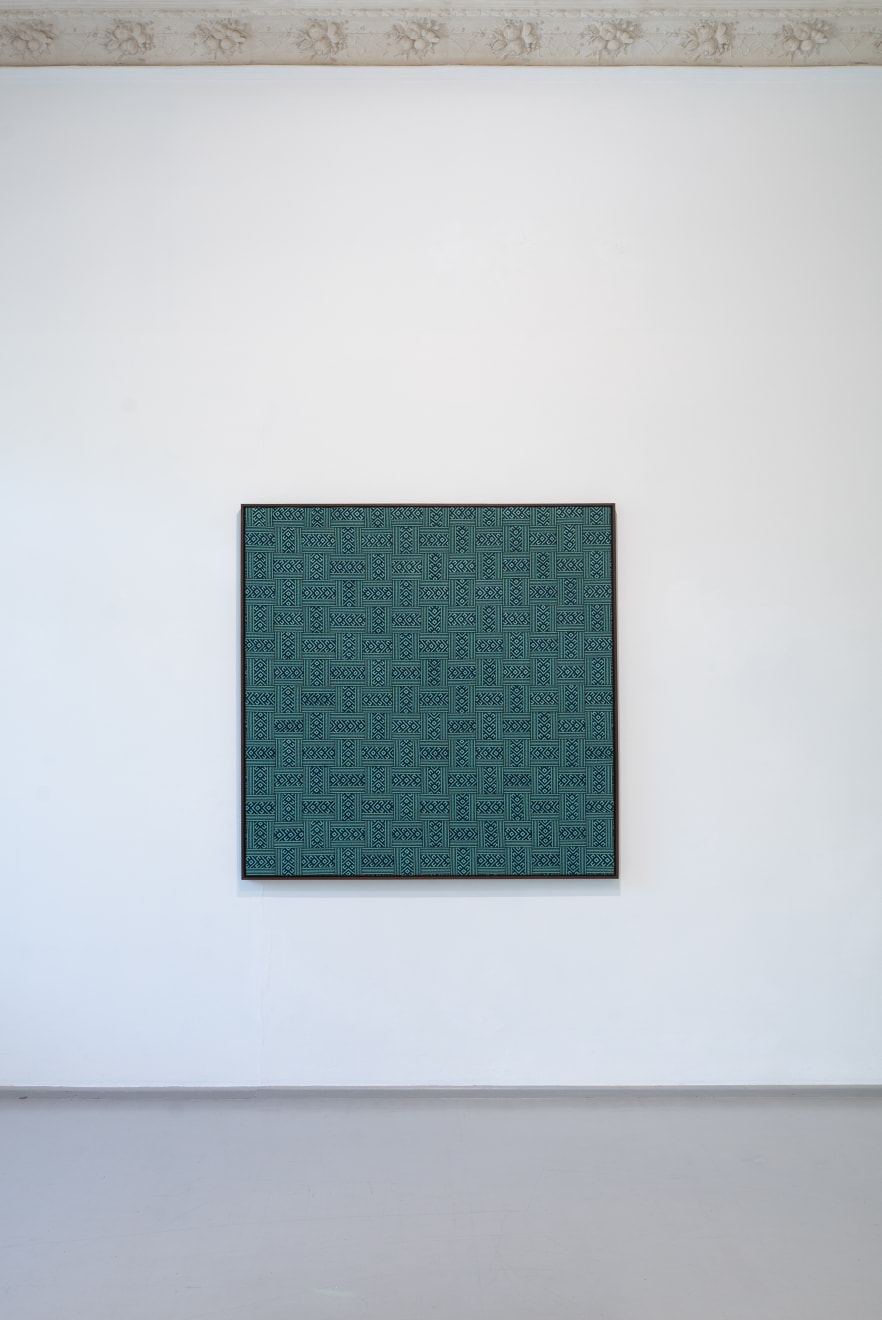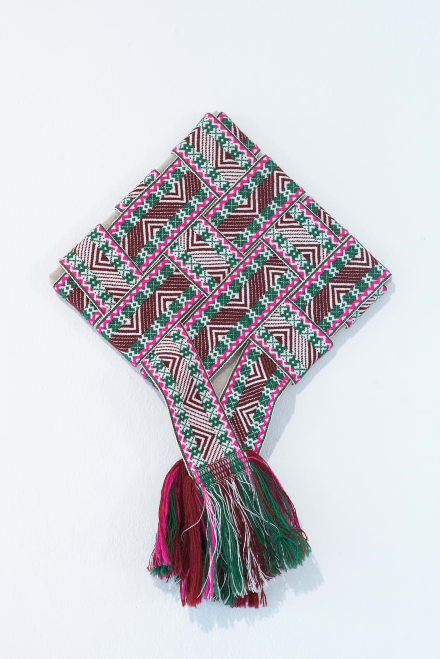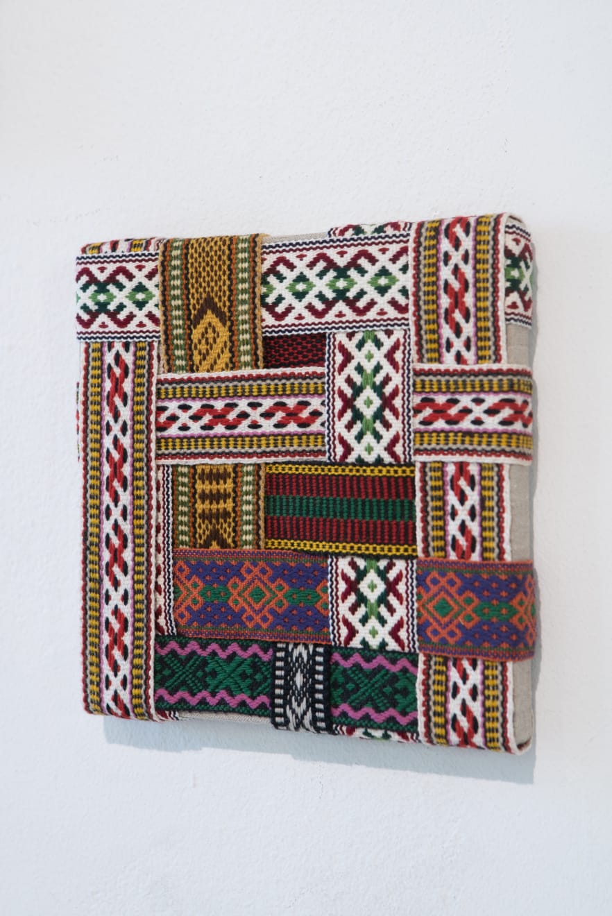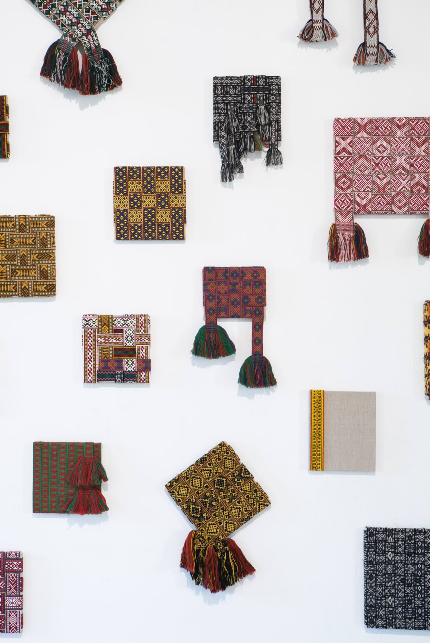 In the series ‘From.Between.To’, Šerpytytė employs ceremonial sashes specific to the Baltic region, overlapping and layering them across canvas stretchers. Using traditional materials, these works trace how the region’s communities intersect; motifs from one country are legible in another and reveal a call and response between nations that share a narrative of conflict. She also looks at how the repetition – or rhythm – of these patterns might be understood as a wider visual language, one that can communicate between cultures or regions familiar with war. Just as linguistic forms of expression facilitate a communal purpose, so visual matter can be incorporated into a process of mutual understanding.
