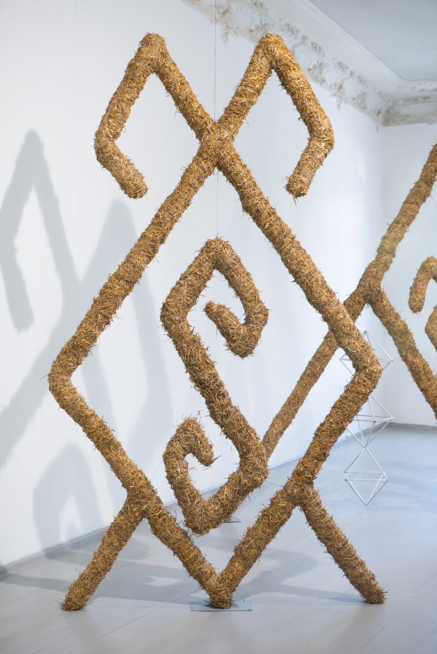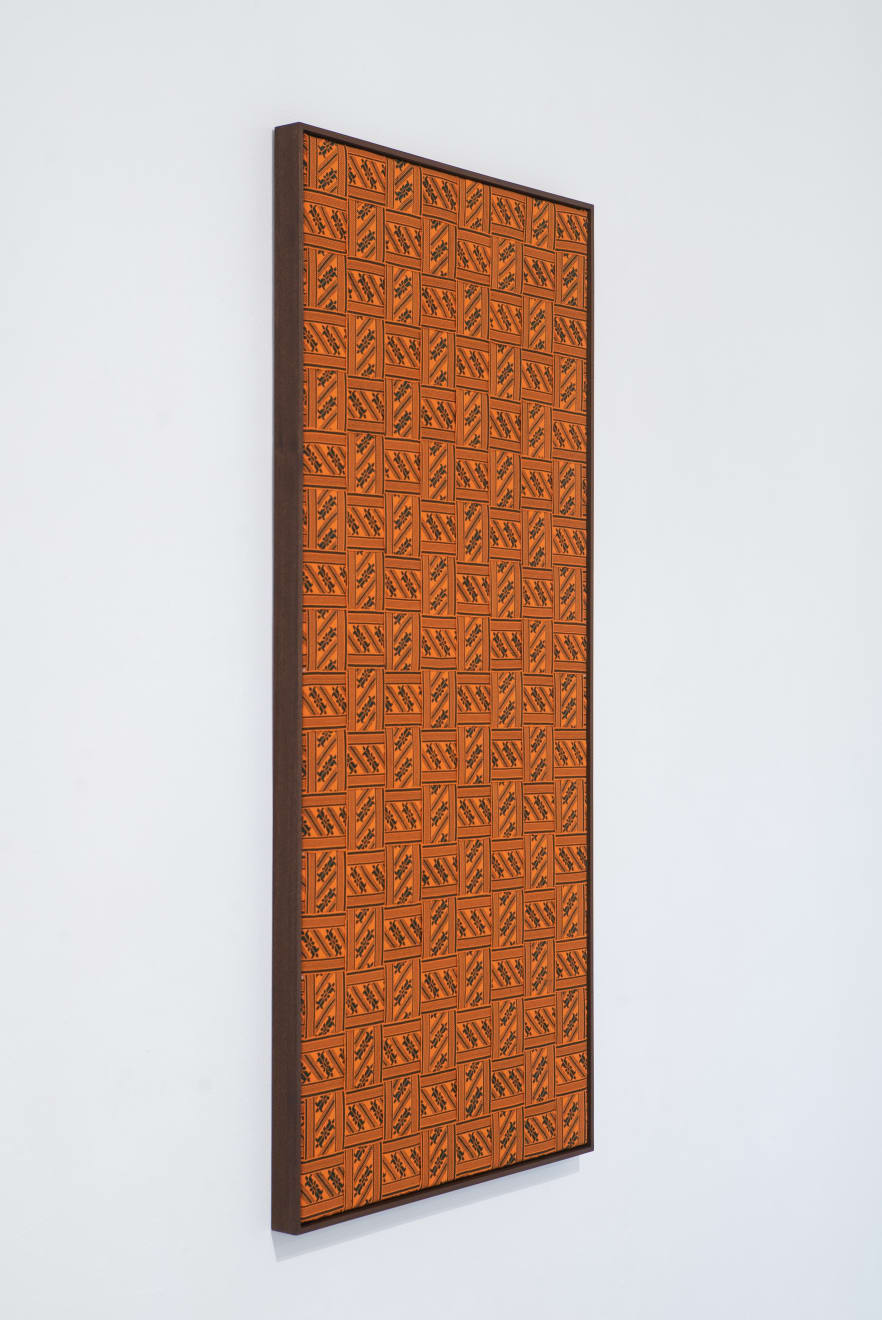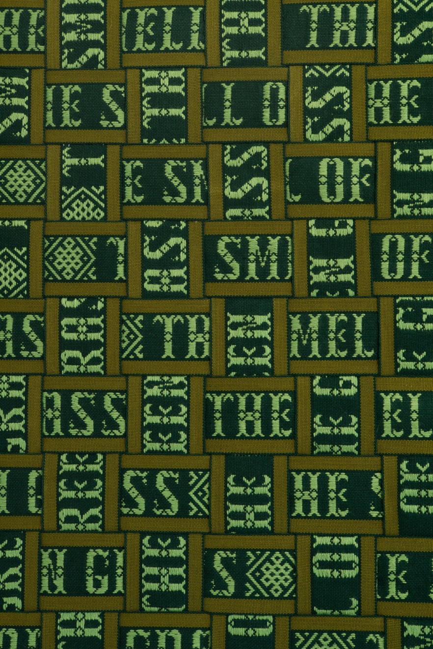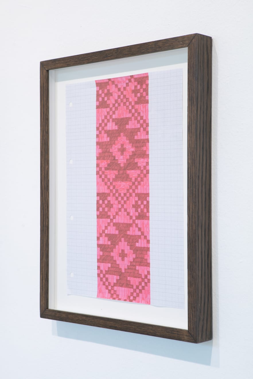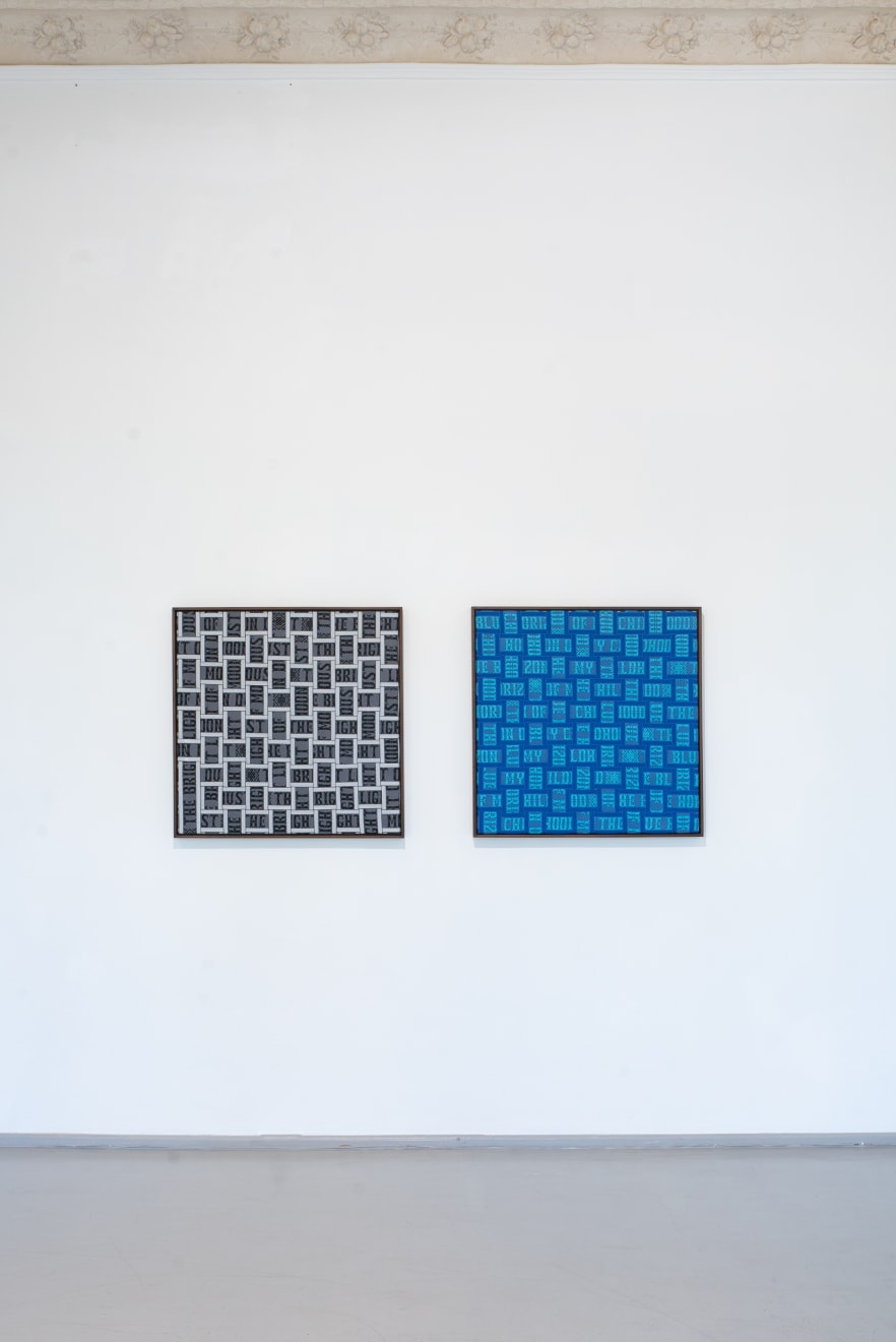 In the series ‘From.Between.To’, Šerpytytė employs ceremonial sashes specific to the Baltic region, overlapping and layering them across canvas stretchers. Using traditional materials, these works trace how the region’s communities intersect; motifs from one country are legible in another and reveal a call and response between nations that share a narrative of conflict. She also looks at how the repetition – or rhythm – of these patterns might be understood as a wider visual language, one that can communicate between cultures or regions familiar with war. Just as linguistic forms of expression facilitate a communal purpose, so visual matter can be incorporated into a process of mutual understanding.