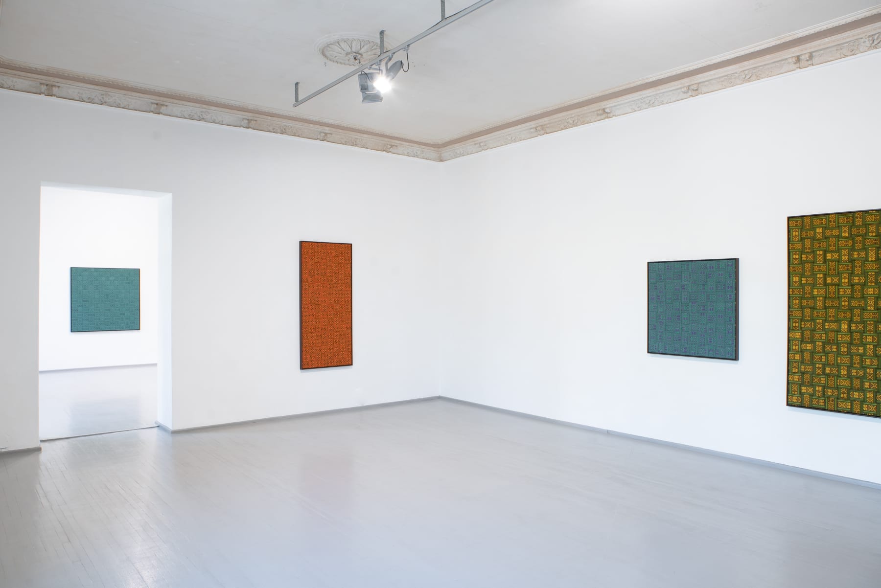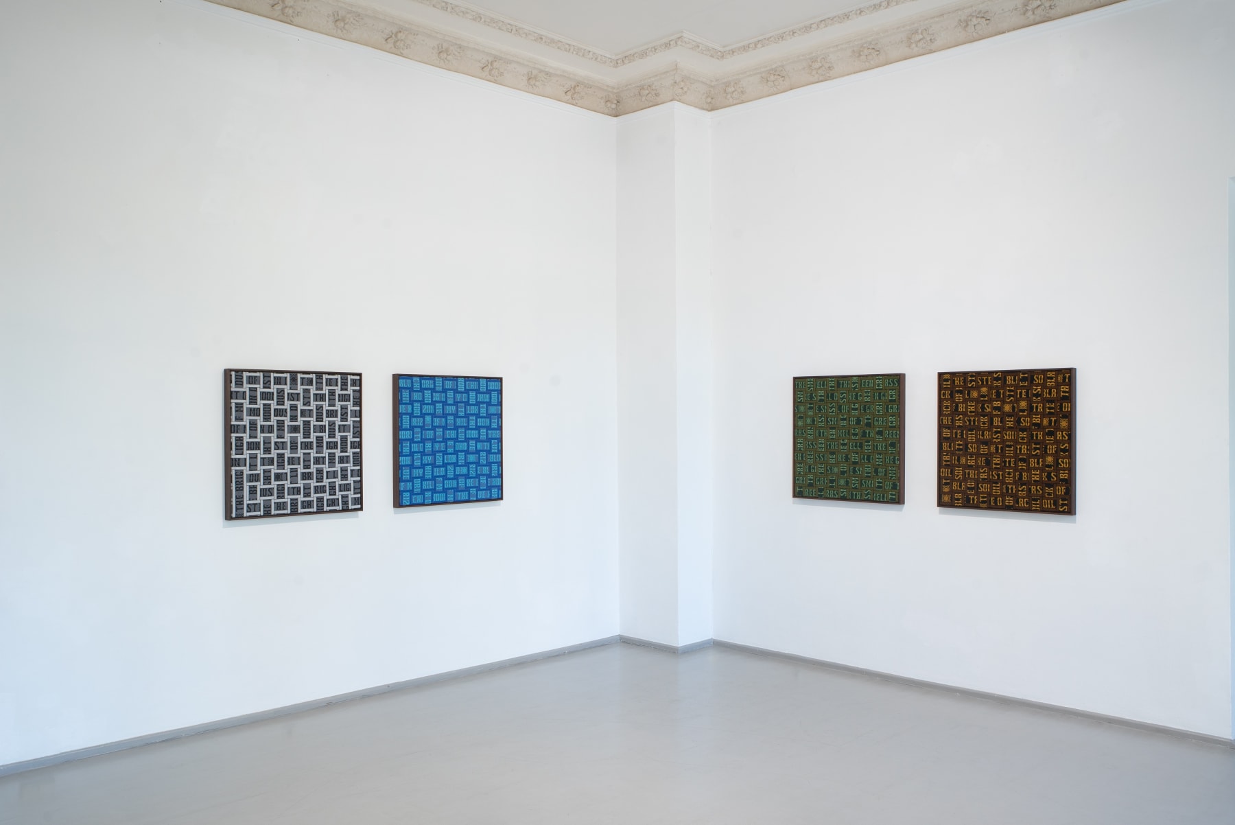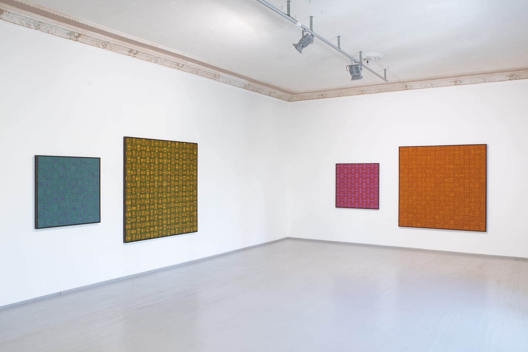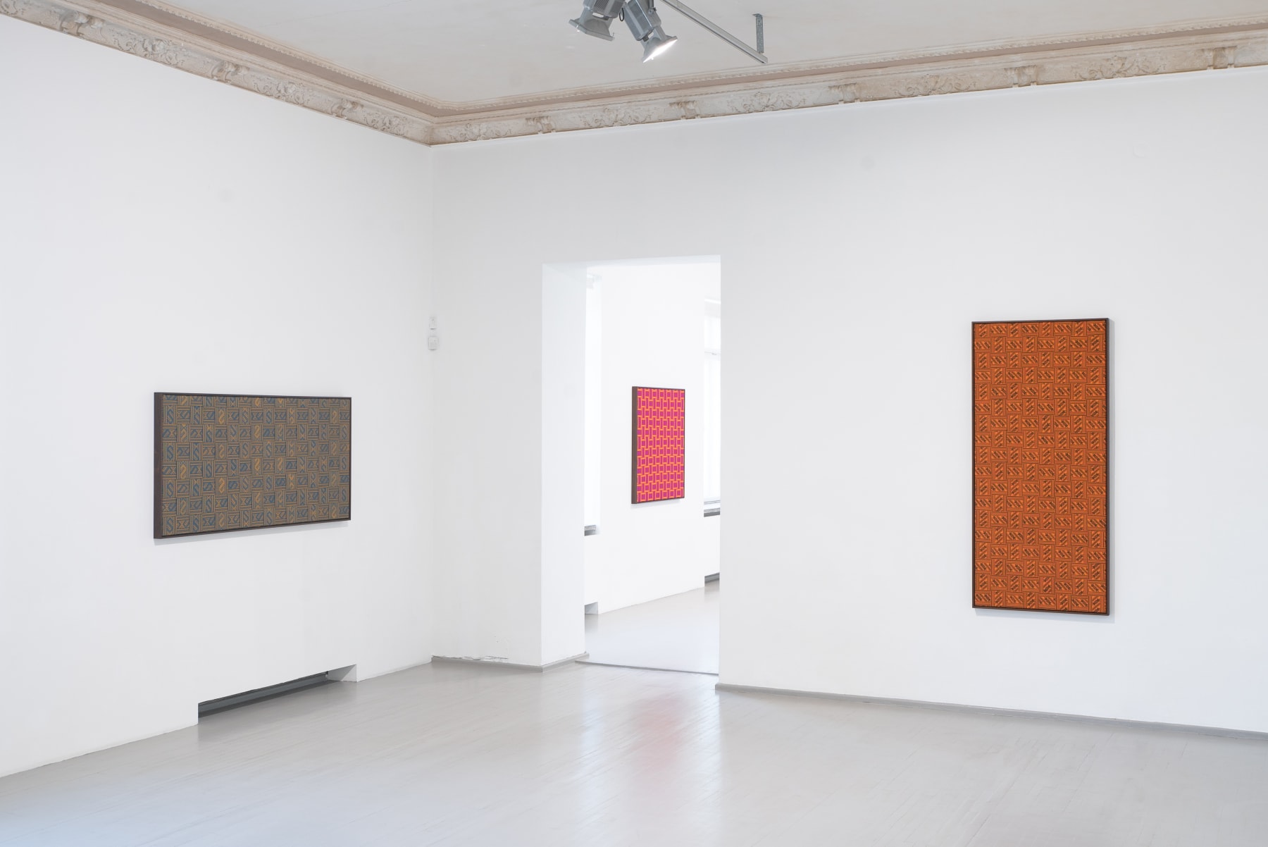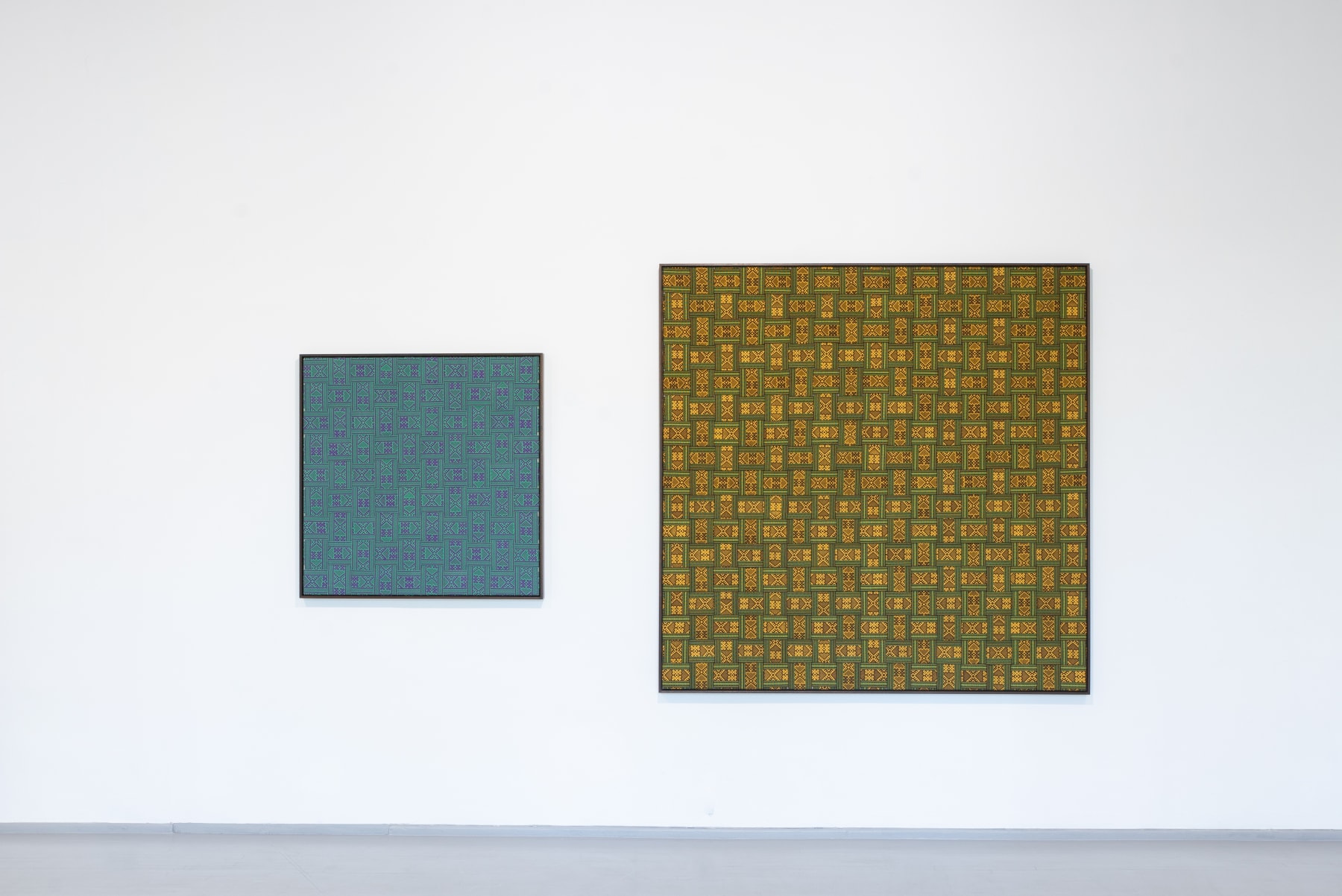 In the series ‘From.Between.To’, Šerpytytė employs ceremonial sashes specific to the Baltic region, overlapping and layering them across canvas stretchers. Using traditional materials, these works trace how the region’s communities intersect; motifs from one country are legible in another and reveal a call and response between nations that share a narrative of conflict. She also looks at how the repetition – or rhythm – of these patterns might be understood as a wider visual language, one that can communicate between cultures or regions familiar with war. Just as linguistic forms of expression facilitate a communal purpose, so visual matter can be incorporated into a process of mutual understanding.
