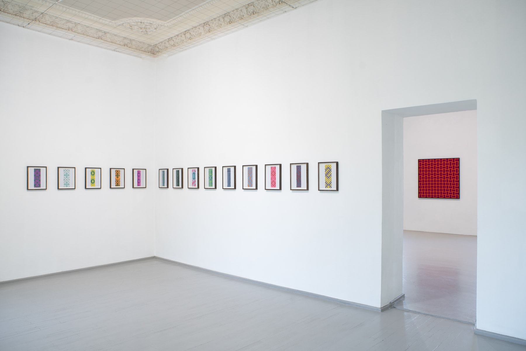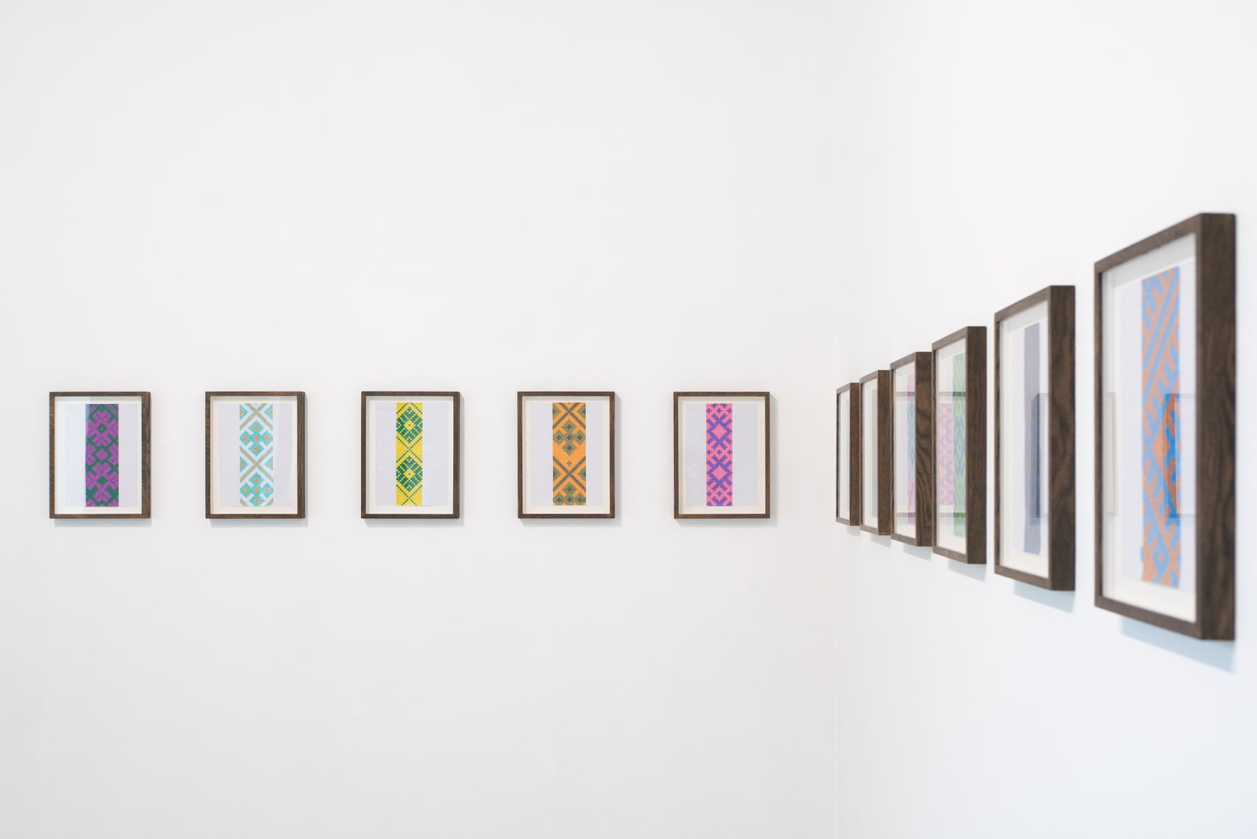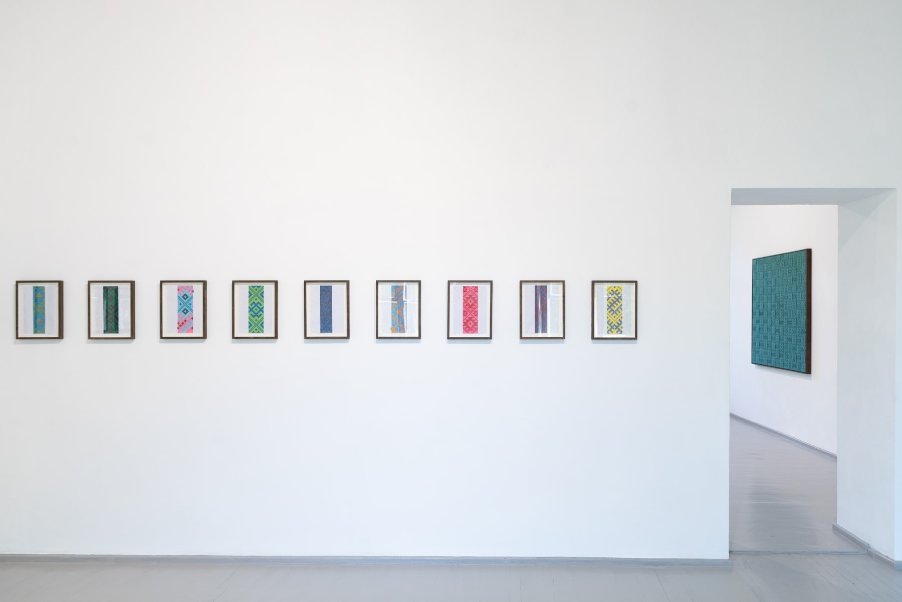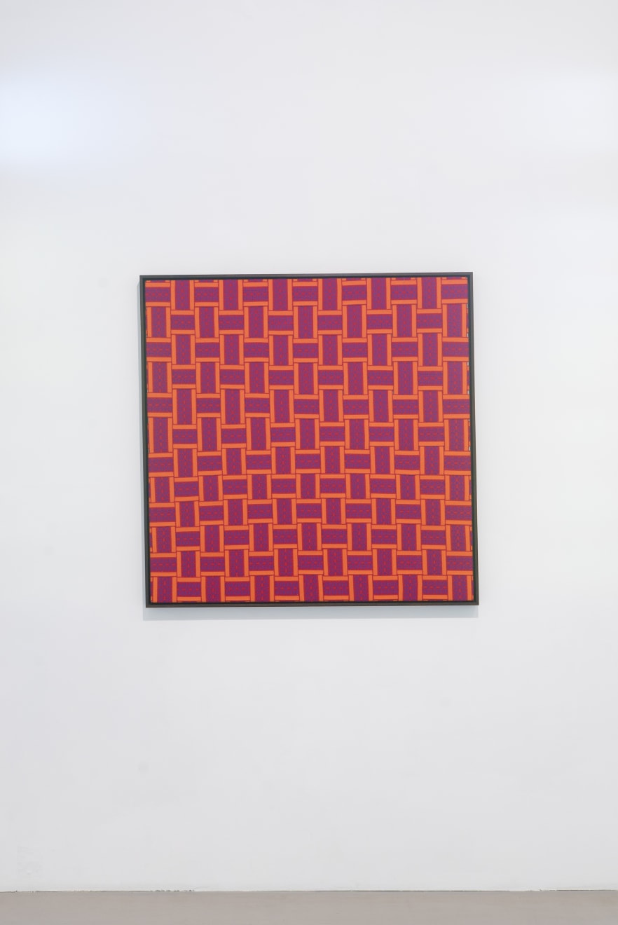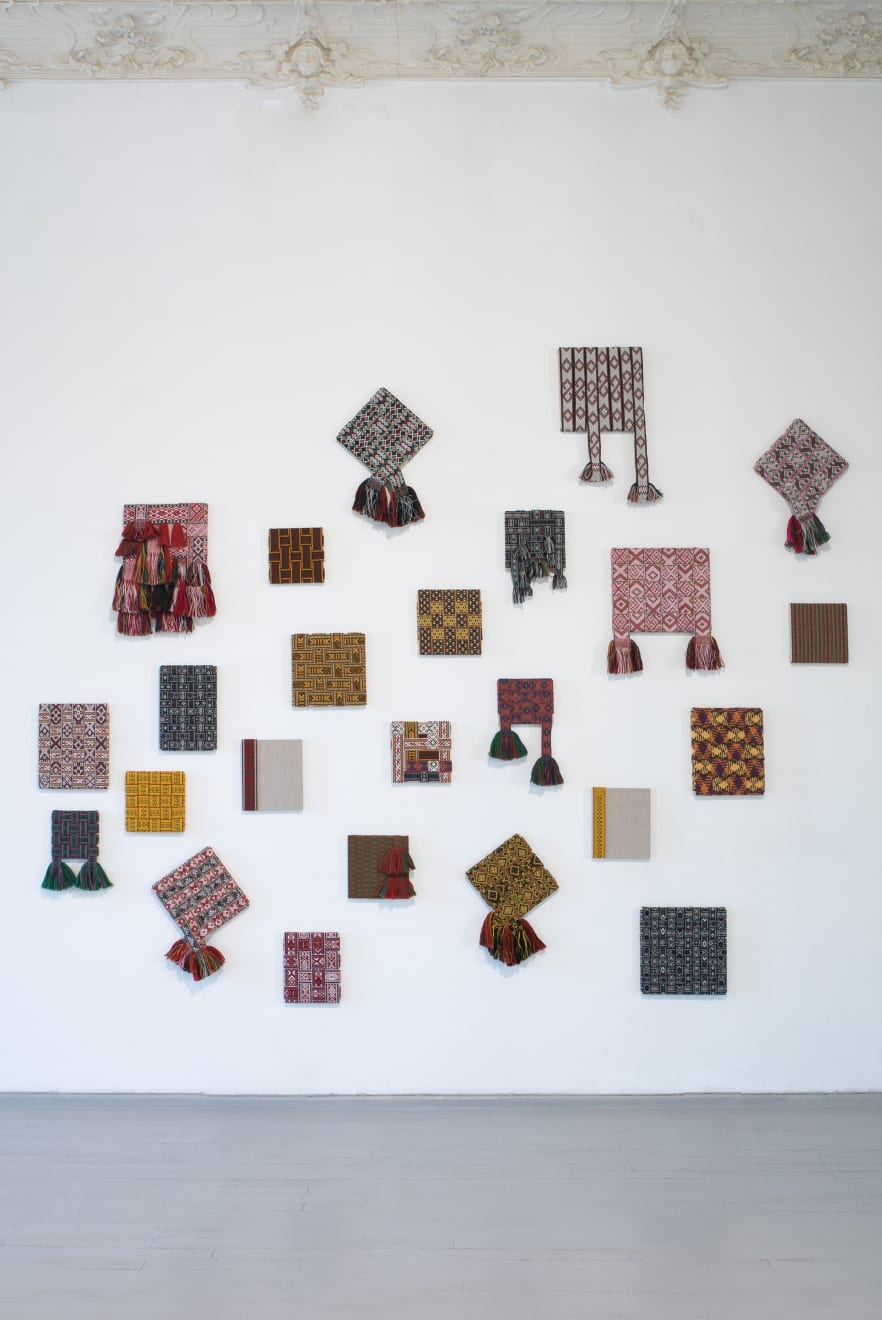 Away from the Baltic context the works also address a different history, that of international Modernism and in particular the development of abstraction and the concept of the Readymade. By weaving the sashes into complex grids on canvas stretchers Šerpytytė recalls the tropes of geometric abstraction. By using them unaltered, as Readymades, she both celebrates and deconstructs their historic meaning. Having initially begun the series working with traditional colour schemes – typically, reds, yellows, black and white – she now also collaborates with the weavers to produce the sashes in vibrant colours that recall the chromatic intensity of Pop and Op art, furthering the layered referentiality of the works.
