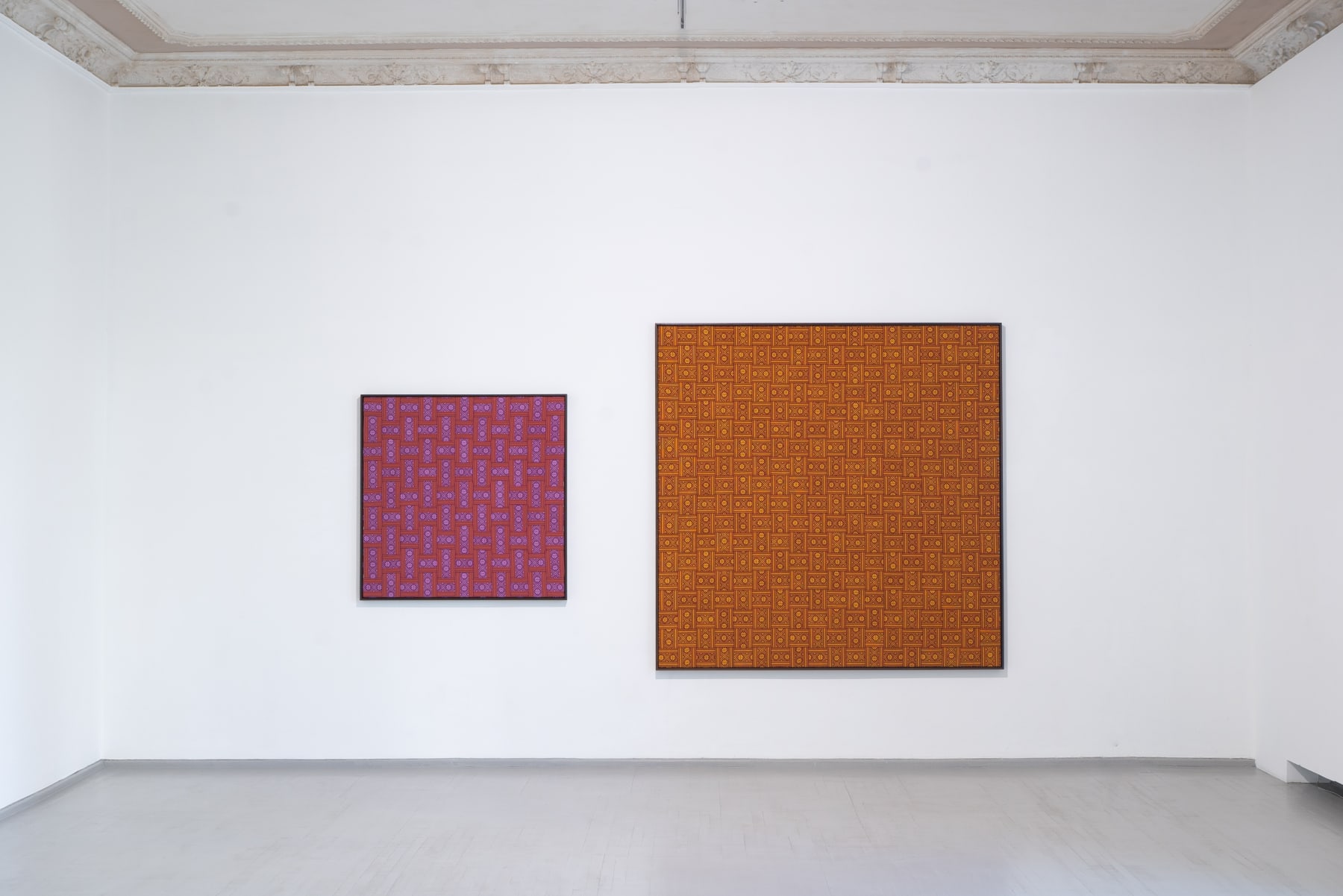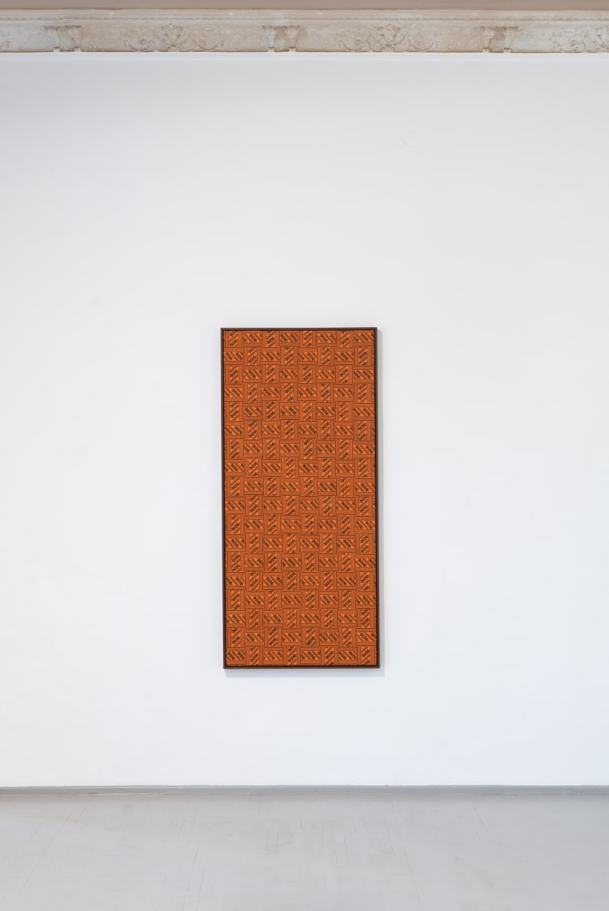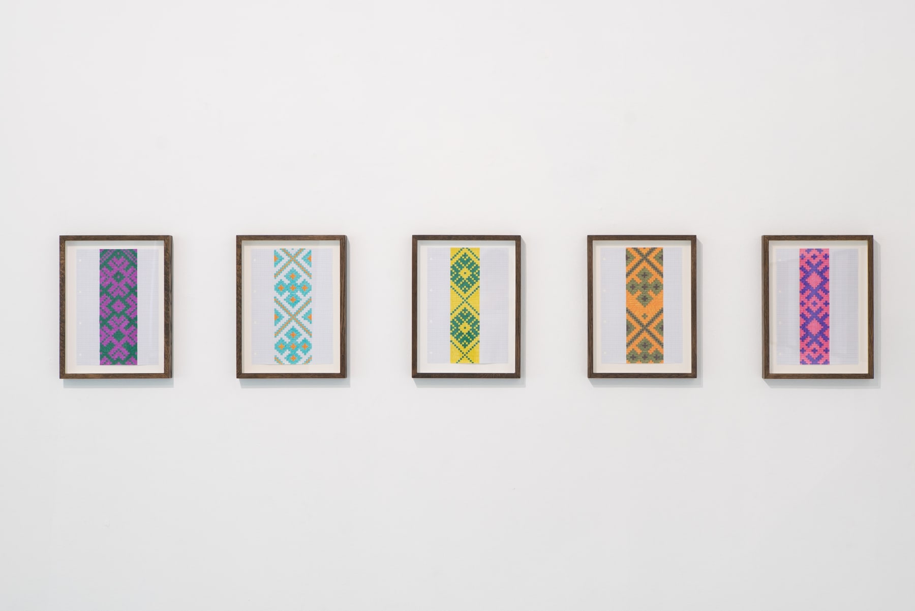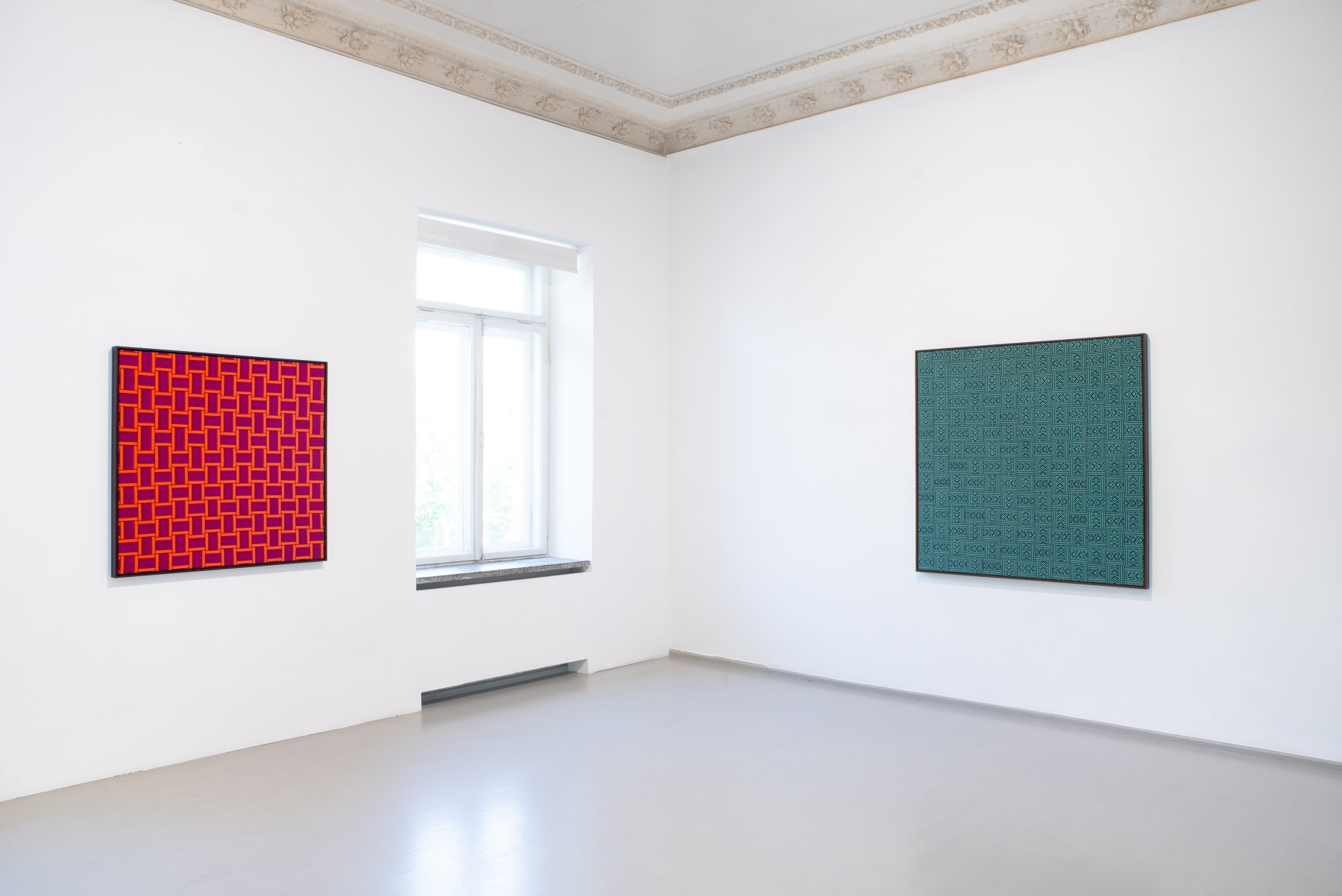 Away from the Baltic context the works also address a different history, that of international Modernism and in particular the development of abstraction and the concept of the Readymade. By weaving the sashes into complex grids on canvas stretchers Šerpytytė recalls the tropes of geometric abstraction. By using them unaltered, as Readymades, she both celebrates and deconstructs their historic meaning. Having initially begun the series working with traditional colour schemes – typically, reds, yellows, black and white – she now also collaborates with the weavers to produce the sashes in vibrant colours that recall the chromatic intensity of Pop and Op art, furthering the layered referentiality of the works.