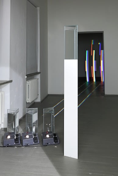 In the light dispersion installation that occupies two of the gallery's rooms, colours are carved out by using special stencils, split, and then joined back together. This process of colour generation can be observed with the naked eye or through huge lenses – prisms filled with water.