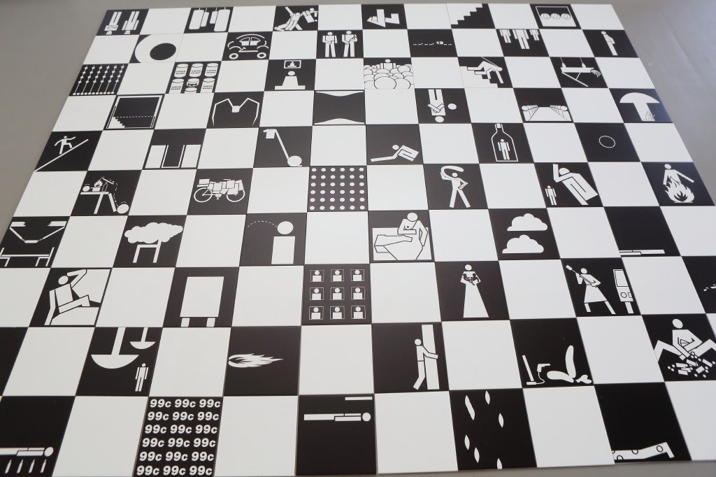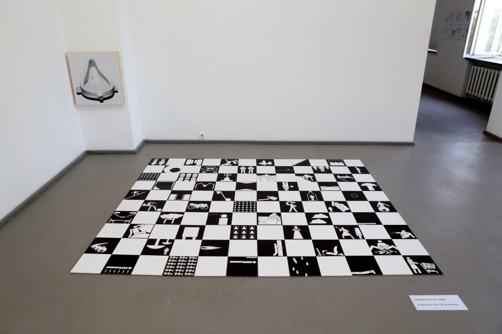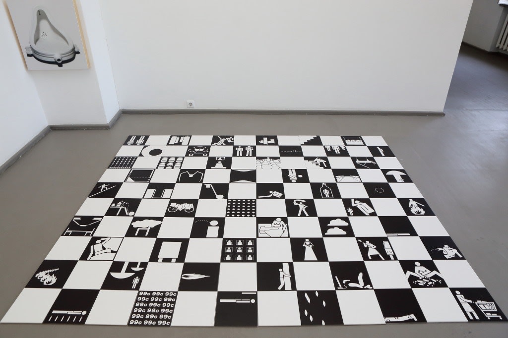 Stano Masár is a postconceptual artist working in the media of installation, object, light art and video. In his works he often uses and manipulates the most important artworks in the history of art. Author with the sense of humour and a little bit of criticism tries to show and define the established and universal history of art, a schematic view of it. Stano Masár brings to Vilnius rearticulated masterpieces of art history - Michelangelo's Last Judgement and famous names of current artistic scene - such as Damien Hirst, Mauritio Cattelan or Pipilotti Rist. One man show in Vartai Gallery follows the systematic research and subsequent transformation and manipulation of art history. This manipulation is based on the conjunction of the citation of the popular art work and the idea of “global” – generalization, uniformity, schemes which are characteristic for the common popular perception of the history of art. Author with the sense of humour and a little bit of criticism tries to show and define Euro –American space-time of the established and universal history of art, a schematic view of it. In the project Contemporary Visual Art Stano Masár unified the general known works to the uniform language of pictograms which compresses the most significant features of them. He is exceeding the boundaries between art and design by application of pictograms on the floor, children´s puzzles, chess table and so on. Curator: Juraj Čarný.