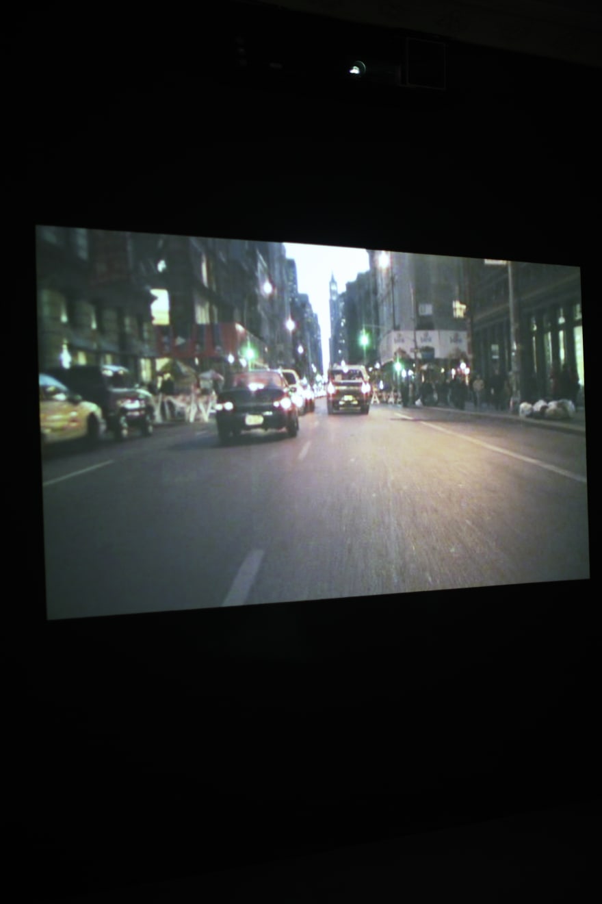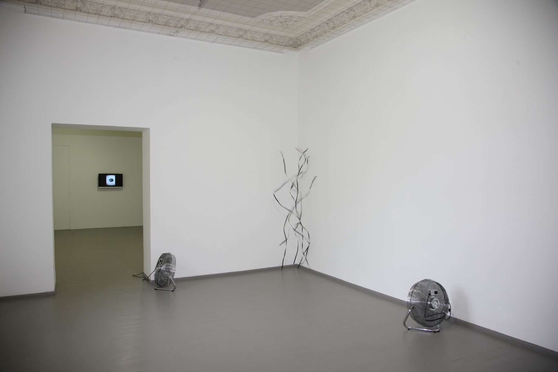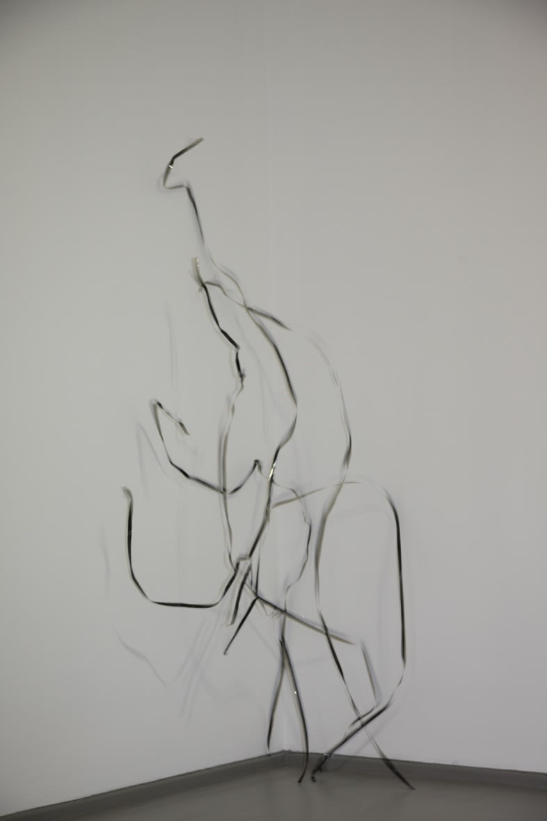 creating spectacular physical and optical experience while walking through the space - installation Columns (2006). Walking further the eyes meet a minimalist in its expression installation Serpentine (2010) in which the stripes of magnetic tapes held by the blowing fans dance freely in a corner of the room. Making a turn to the right the viewer virtually enters the streets of Manhattan (NYC), captured by the artist’s one hour bike trip. Four video cameras fixed to his bike form a hyperactive, multipart constellation through the fast-paced metropolis. (Bike Messenger, 2006). In the back of the gallery Kempinas presents his latest, previously unseen ink drawings on paper, executed employing a fan. (Fan Drawings, 2010). The exhibition is completed by the rather unexpected hypnotic, brightly coloured installation Ballroom (2010). The latter work opened the New York exhibition season at the Yvon Lambert gallery in the fall of 2010.