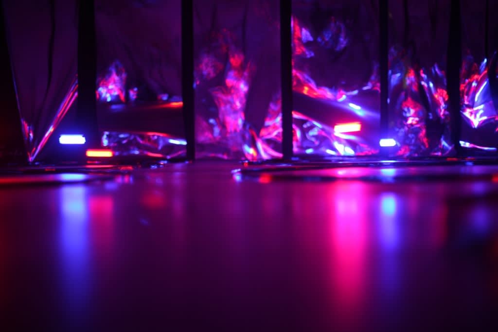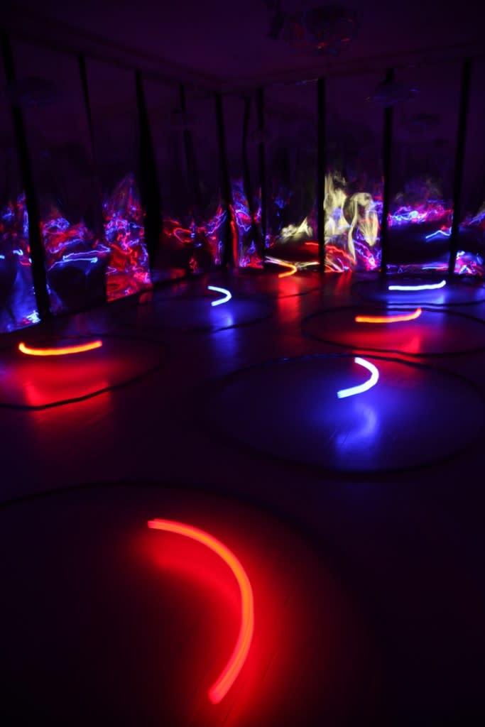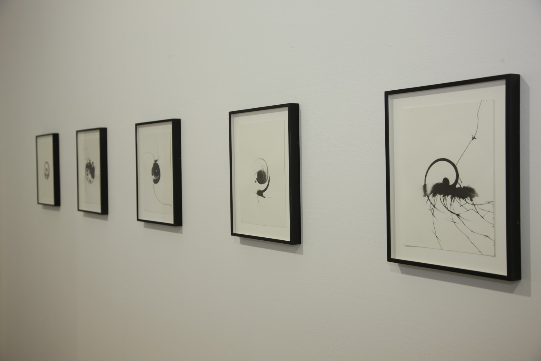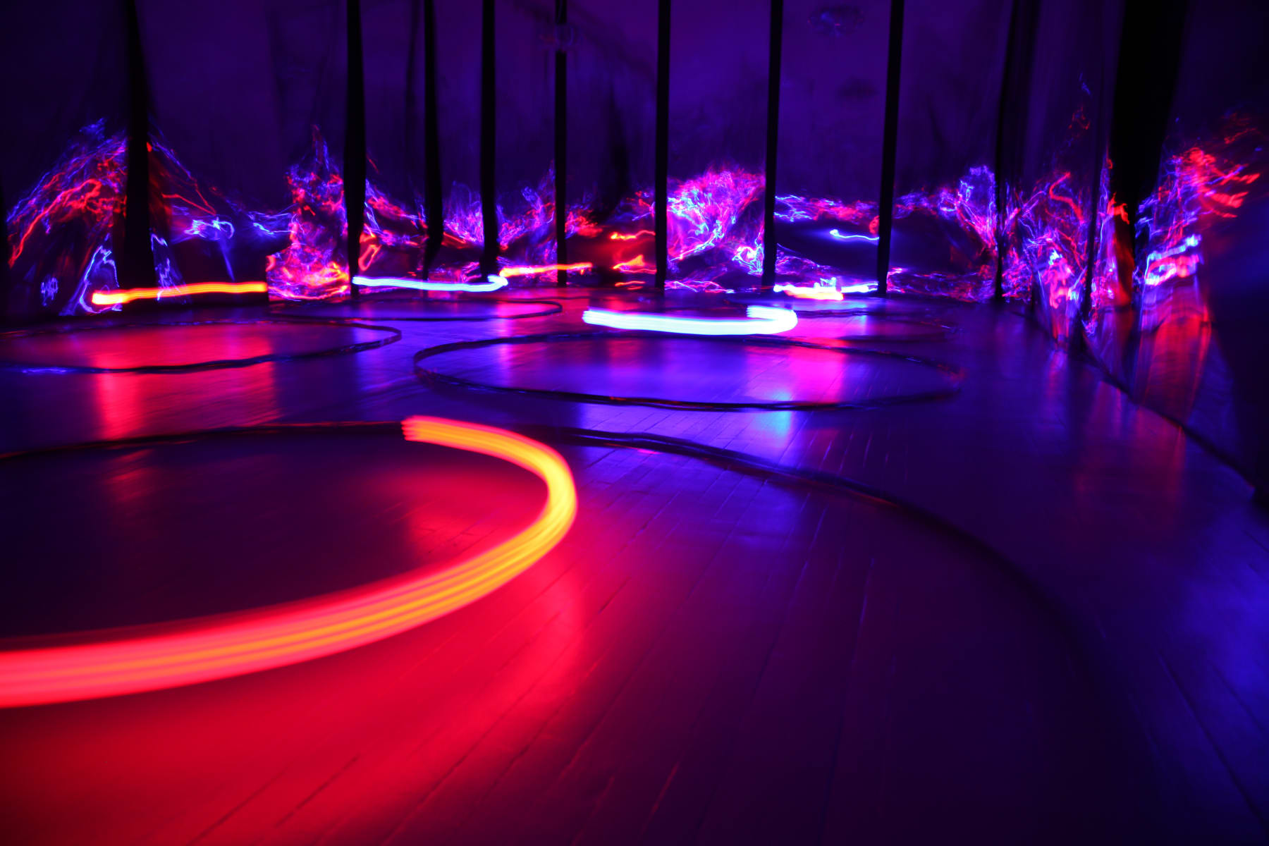 creating spectacular physical and optical experience while walking through the space - installation Columns (2006). Walking further the eyes meet a minimalist in its expression installation Serpentine (2010) in which the stripes of magnetic tapes held by the blowing fans dance freely in a corner of the room. Making a turn to the right the viewer virtually enters the streets of Manhattan (NYC), captured by the artist’s one hour bike trip. Four video cameras fixed to his bike form a hyperactive, multipart constellation through the fast-paced metropolis. (Bike Messenger, 2006). In the back of the gallery Kempinas presents his latest, previously unseen ink drawings on paper, executed employing a fan. (Fan Drawings, 2010). The exhibition is completed by the rather unexpected hypnotic, brightly coloured installation Ballroom (2010). The latter work opened the New York exhibition season at the Yvon Lambert gallery in the fall of 2010.