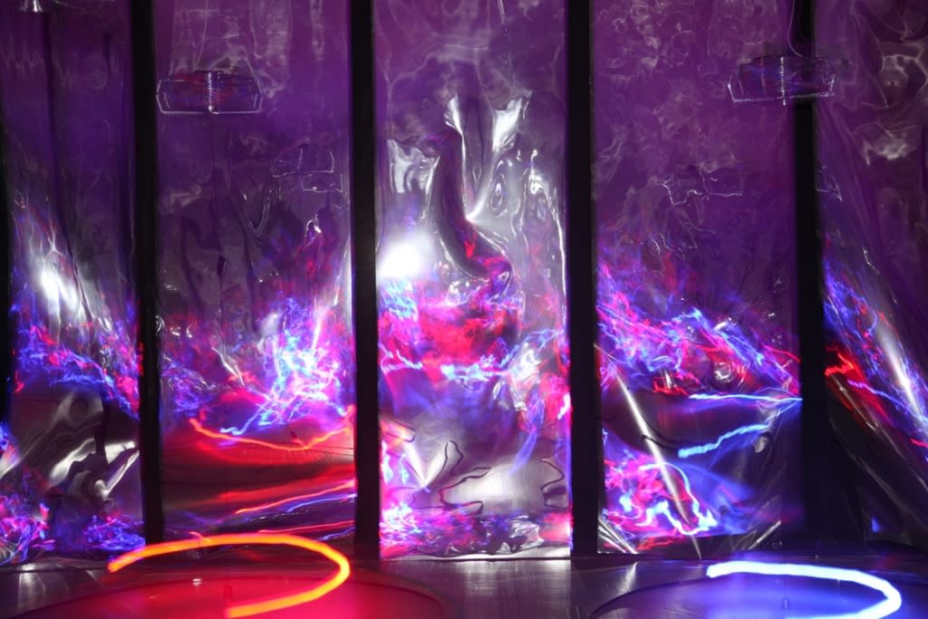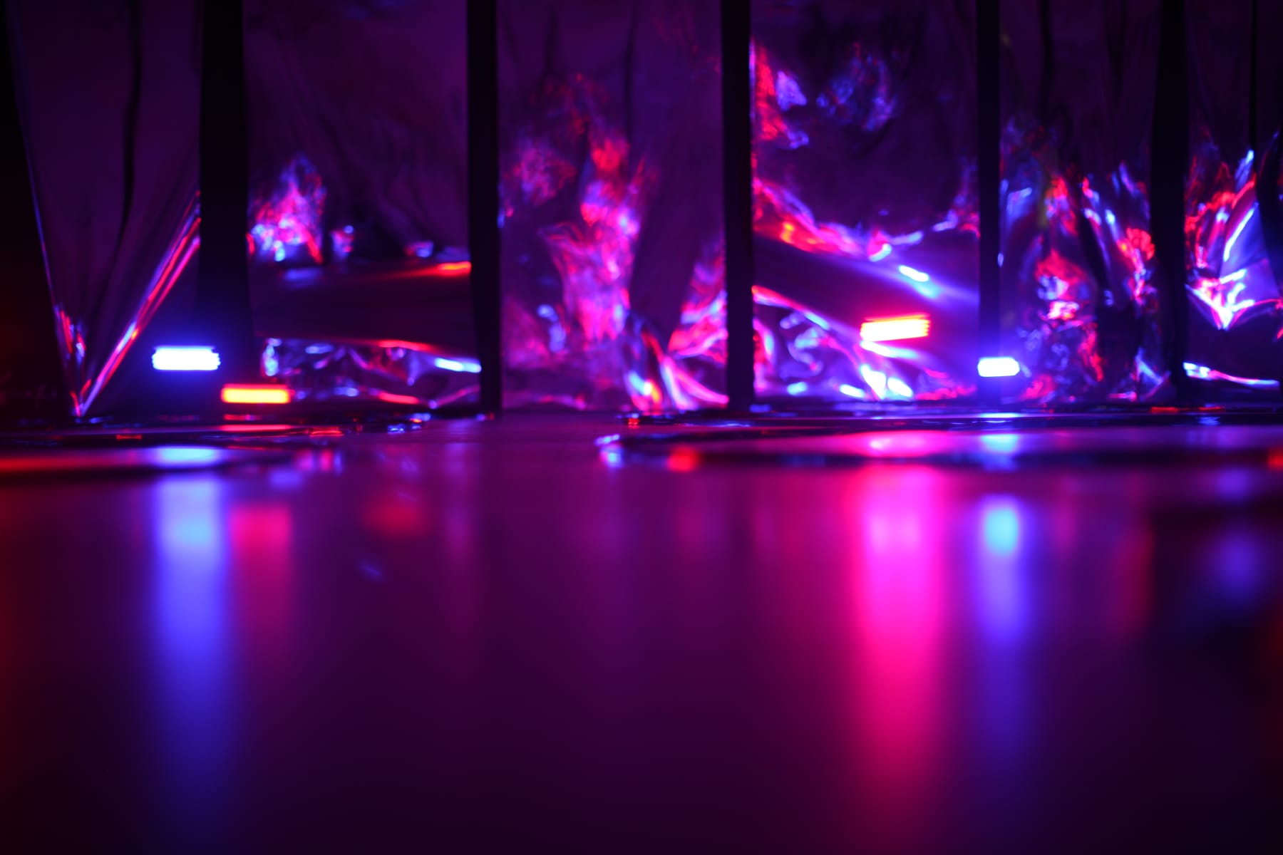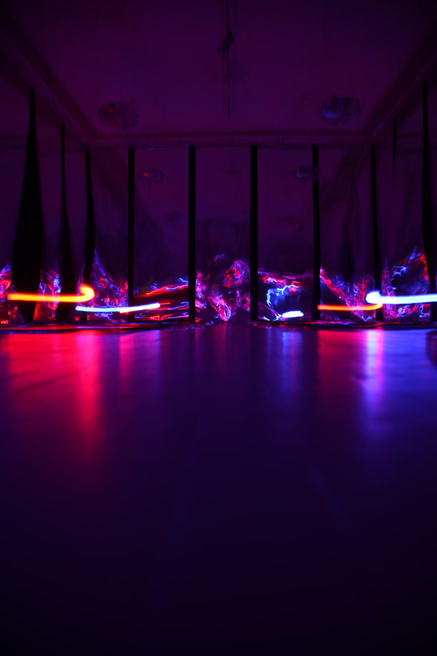 The exhibition at Vartai showcases five Kempinas' installations, representing different media in different periods of time. The first room of the gallery transforms into a forest of translucent columns of stretched video tape,